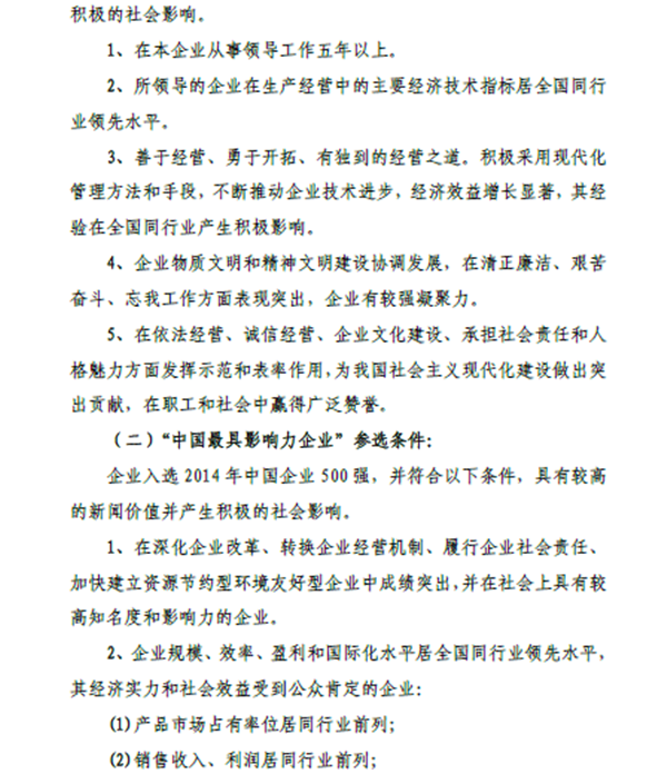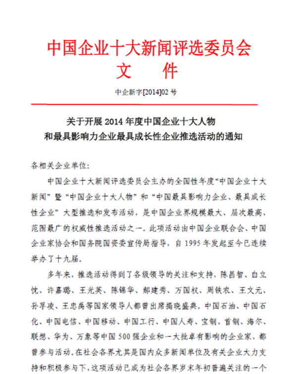 自1995年起至今由中国企业联合会、中国企业家协会和国务院国资委宣传局指导,年度中国企业十大人物和最具影响力企业最具成长性企业推选活动以举办十九届。2014年度中国企业十大人物和最具影响力企业最具成长性企业推选活动正式启动,下文为此次活动文件。(此次活动评选申报表在文件下方)