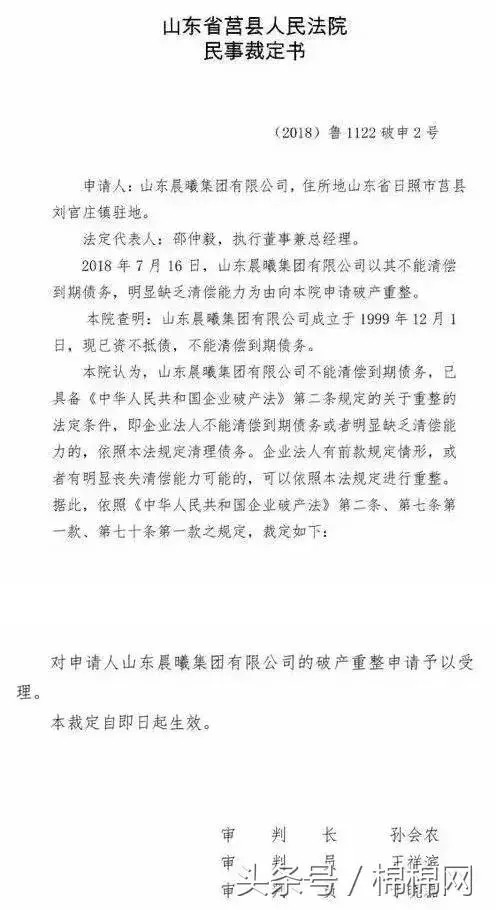 (上图为法院关于受理晨曦破产申请的裁定书)