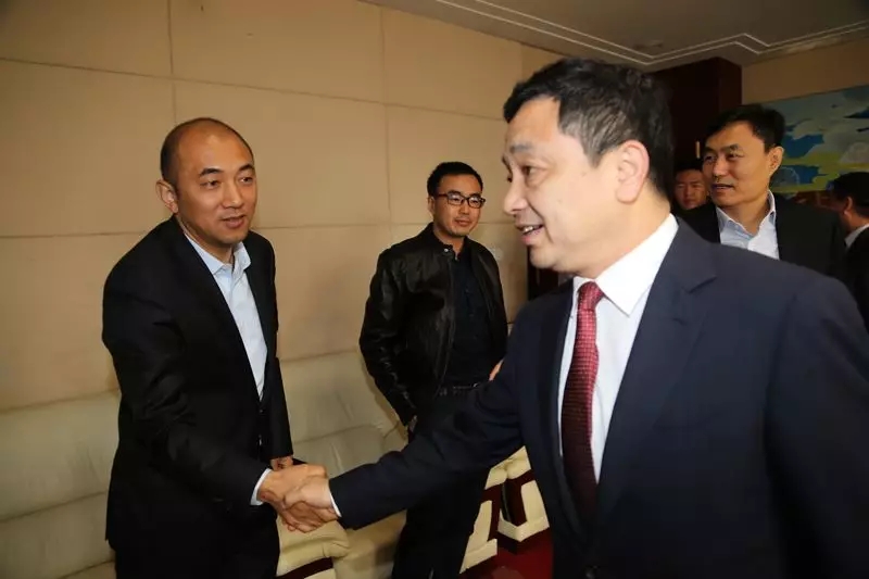 澄城县长白泉朝(右)与中富国勇董事长刘富勇握手交谈