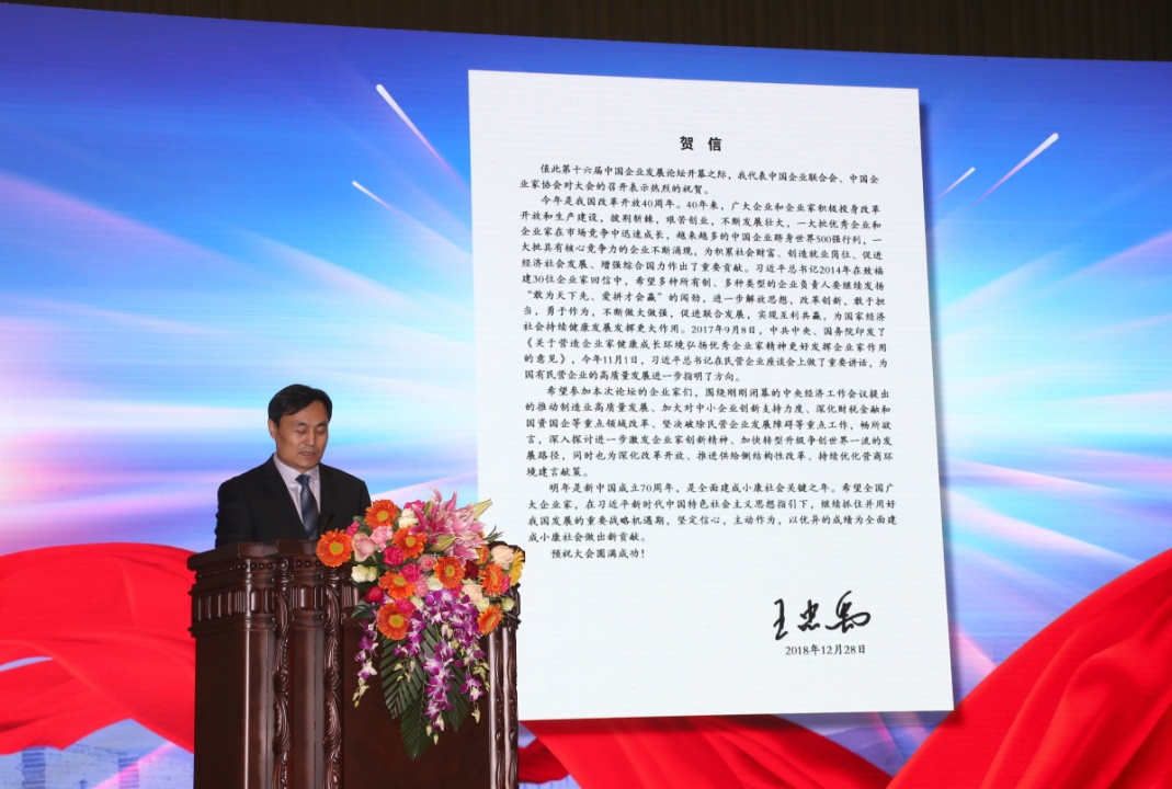 王忠禹在贺信中表示,2017年9月8日,中共中央、国务院印发了《关于营造企业家健康成长环境弘扬优秀企业家精神更好发挥企业家作用的意见》,今年11月1日,习近平总书记在民营企业座谈会上做了重要讲话,为国有、民营企业的高质量发展进一步指明了方向。希望参加本次论坛的企业家们,围绕刚刚闭幕的中央经济工作会议提出的推动制造业高质量发展、加大对中小企业创新支持力度、深化财税金融和国资国企等重点领域改革、坚决破除民营企业发展障碍等重点工作,畅所欲言,深入探讨进一步激发企业家创新精神、加快转型升级争创世界一流的发展路径,同时也为深化改革开放、推进供给侧结构性改革、持续优化营商环境建言献策。