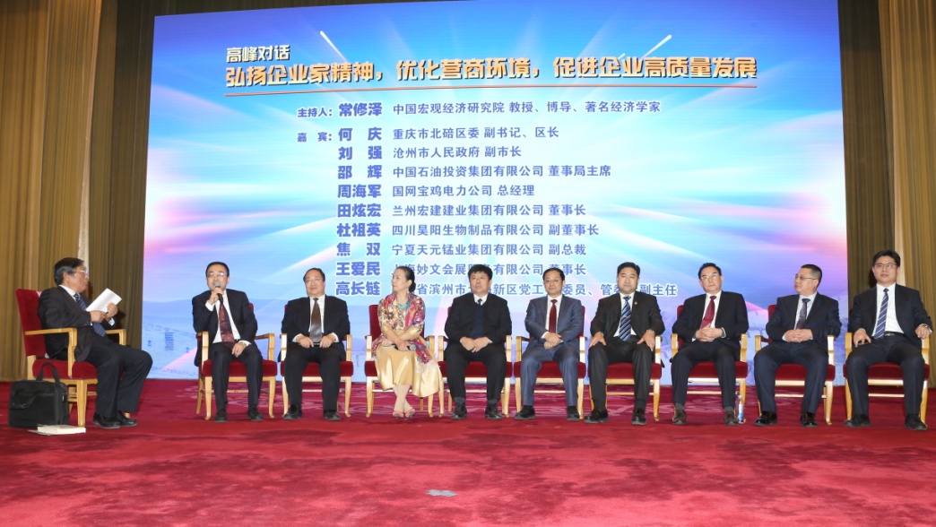 在论坛研讨环节,重庆市北碚区委副书记、区政府区长何庆、沧州市人民政府副市长刘强、中国石油投资集团有限公司董事局主席邵辉、国网宝鸡电力公司总经理周海军、兰州宏建建业集团有限公司董事长田炫宏、四川昊阳生物制品有限公司副董事长杜祖英、上海妙文会展服务有限公司董事长王爱民、山东省滨州市北海新区党工委委员、管委会副主任高长链等分别作为政府和企业的代表,就企业家精神、营商环境优化对企业的创新引领作用各抒己见。