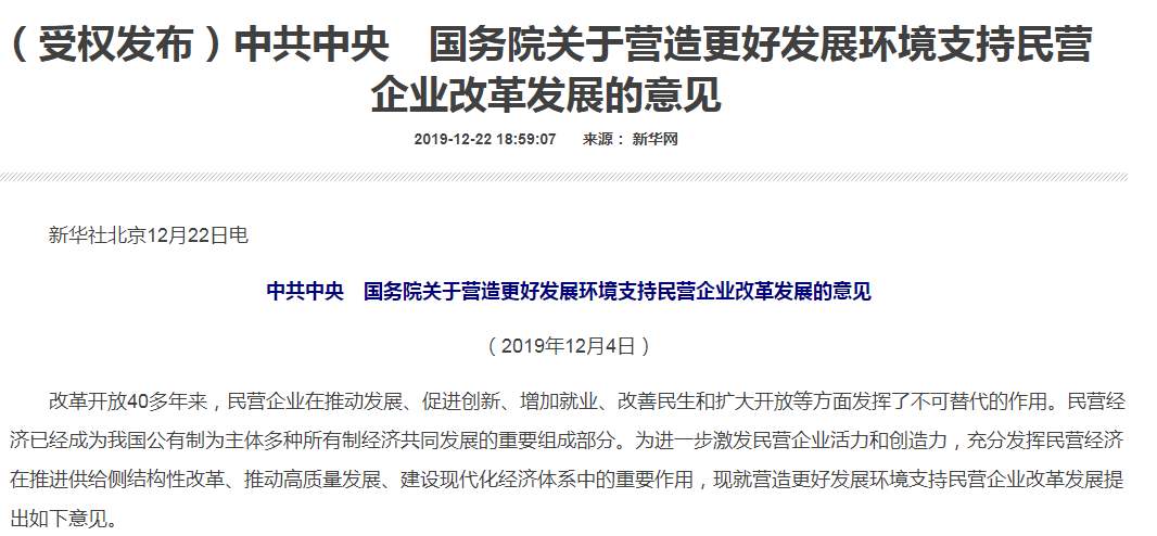 改革开放40多年来,民营企业在推动发展、促进创新、增加就业、改善民生和扩大开放等方面发挥了不可替代的作用。民营经济已经成为我国公有制为主体多种所有制经济共同发展的重要组成部分。为进一步激发民营企业活力和创造力,充分发挥民营经济在推进供给侧结构性改革、推动高质量发展、建设现代化经济体系中的重要作用,现就营造更好发展环境支持民营企业改革发展提出如下意见。