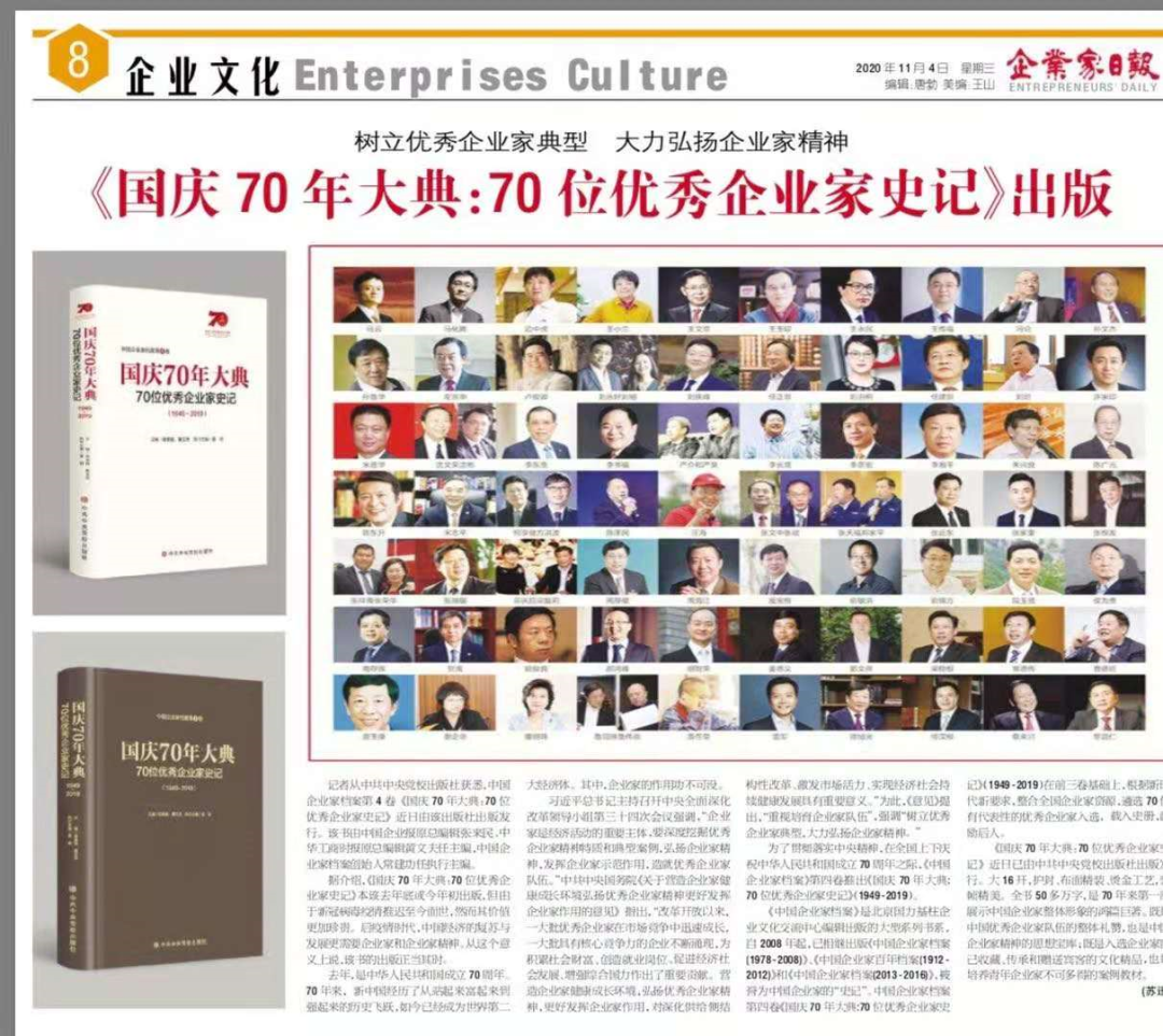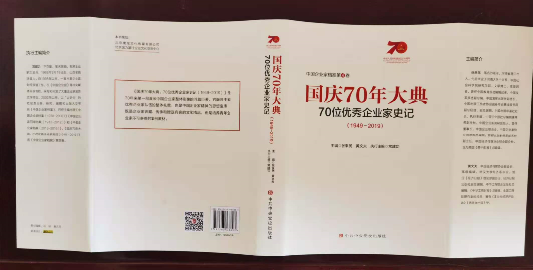 (上图为刚刚由中共中央党校出版社出版的《档案(4)国庆70年大典:70位优秀企业家史记》,由上到下依次为:外封面、绒布烫金内封面、70位企业家合照、图书摆拍和媒体对图书出版的报道及庆贺)