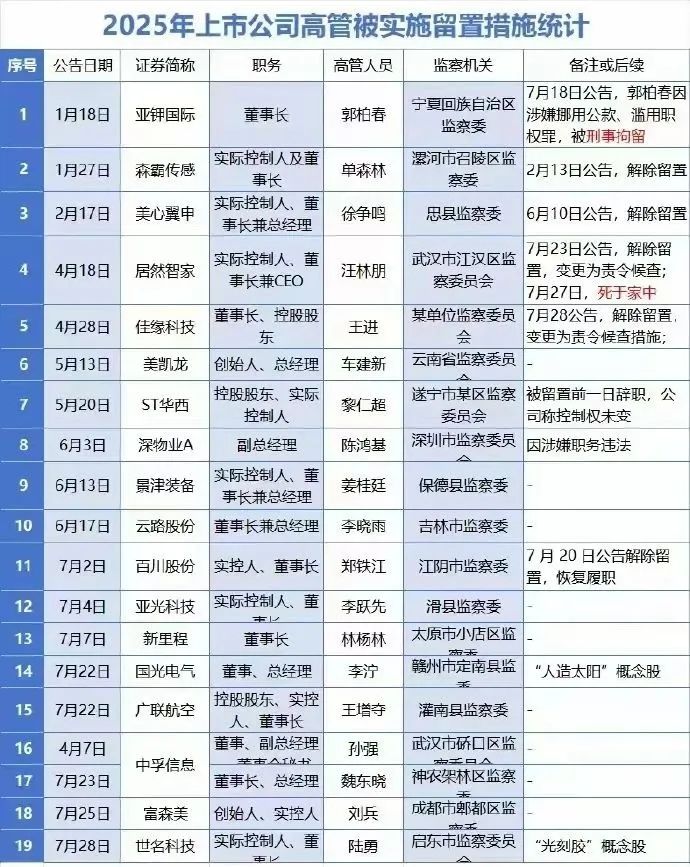 《中共中央国务院关于完善产权保护制度依法保护产权的意见》提出,“严格遵循法不溯及既往、罪刑法定、在新旧法之间从旧兼从轻等原则,以发展眼光客观看待和依法妥善处理改革开放以来各类企业特别是民营企业经营过程中存在的不规范问题。”要严格区分经济纠纷与刑事案件的界限,商事的归商事,刑事的归刑事,对企业家要慎拘慎捕慎留置慎判实刑。但是,近年来,在具体司法实践中,似乎并不乐观。尤其是在经济大环境下行的情况下,许多地方为了实现非税收大幅增加确保GDP增速,热衷于涉企业家的反腐案件。2025年,《监察法》的修订进一步拓宽了监察机关的权限,明确将“非公职人员”涉嫌的职务犯罪纳入其监察范围,对企业家的留置“显著”增多,也造成了一些“意外”。有人统计,2025年有19位上市公司高管被实施留置措施,他们是:亚钾国际董事长郭柏春,森霸传感董事长单森林,美心翼甲董事长兼总经理徐争明,居然智家董事长汪林朋,佳源科技董事长王进,美凯龙创始人车建新,ST华西实际控制人黎仁超,深物业A副总经理陈鸿基,景津装备董事长姜桂廷,云路股份董事长李晓雨,百川股份董事长郑铁江,亚光科技董事长李跃先,新里程董事长林杨林,国光电气董事总经理李泞,广联航空董事长王增夺,中孚信息董事副总经理孙强和董事长、总经理魏东晓,富森美创始人刘兵,世明科技实际控制人、董事长、总裁陆勇等。汪林朋就是2025年4月17日被武汉市江汉区监察委员会留置。7月23日解除留置。27日晚间,距离他解除留置回归岗位仅过去5天,坠楼身亡……有知情人士透露,留置的过程非常痛苦,没有时间和空间概念,与外界几乎完全隔绝,孤独、寂寞、恐惧……那种精神上的煎熬,一般人即使能够“回来”,也很有可能患上精神疾病而走极端。必须要高度重视留置衍生的“意外”问题。监察办案人员要确保公正执法,对案件终身负责。要做好留置企业家的思想疏通工作,使他们既能积极配合办案,又不会出现人身意外,确保企业的继续经营和发展。