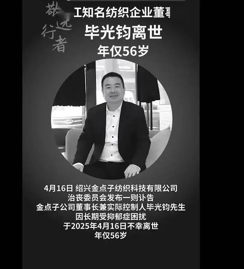 4月16日,浙江绍兴金点子纺织公司创始人毕光钧,享年56岁。